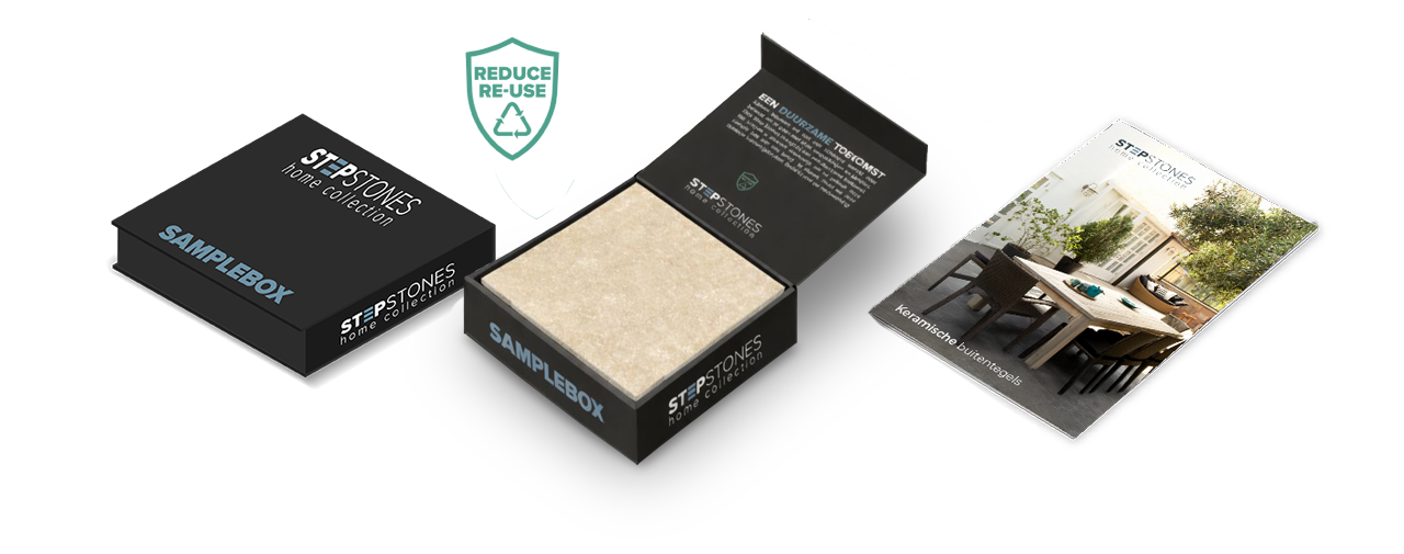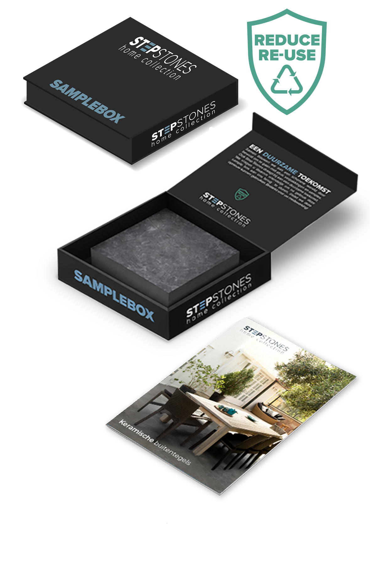 Wilt u deze keramische tegel thuis bekijken? Bestel dan een samplebox met maximaal 4 tegels uit onze collectie. Zo krijgt u een goede indruk van de tegelkleur. De sample is een gedeelte van de originele tegel, dus we adviseren de gehele tegels te komen bekijken in onze showtuin.